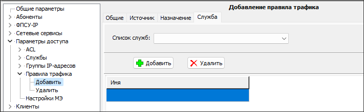 Вкладка «Служба» содержит список служб: дополнительных фильтров, указывающих межсетевому экрану ФПСУ-IP на необходимость применения правила трафика к соединению абонентов из списков «Источник» и «Назначение».