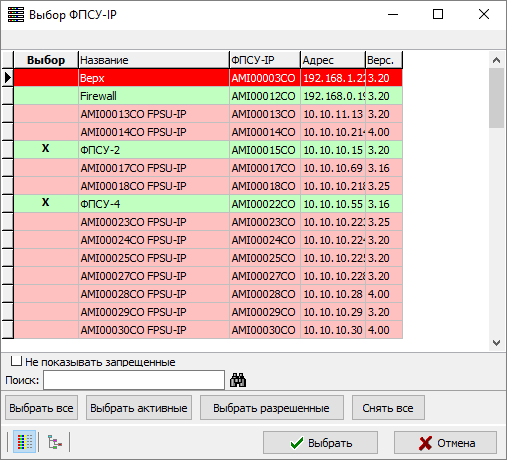 Выбрать ФПСУ-IP можно по нажатию кнопки «ФПСУ-IP». На экран будет выдано окно, в котором следует отметить знаком Х в столбце «Выбор» те ФПСУ-IP, заблокированный трафик которых требуется отслеживать.