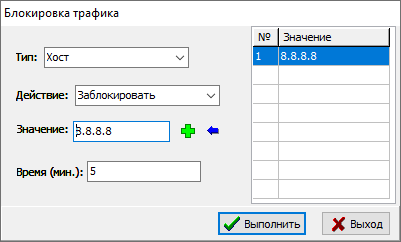 По команде «Блокировка» откроется окно, в котором для блокирования трафика требуется: