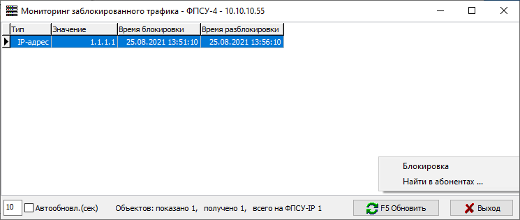 Чтобы обновить полученные от ФПСУ-IP сведения, следует нажать кнопку «F5 Обновить» или установить флаг «Автообновление», указав интервал времени, через который будут производиться повторные запросы. По нажатию правой кнопки мыши в строке списка отображается контекстное меню с командой «Блокировка», если список блокировок не пустой, доступна команда «Найти в абонентах ...». При необходимости блокирования трафика администратором УА ФПСУ-IP должны быть соблюдены условия: