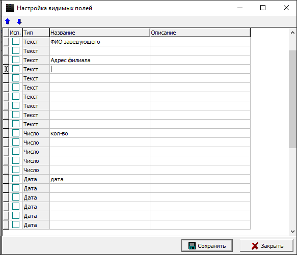 В открывшемся окне предоставляется возможность создать до 10 текстовых полей, до 5 числовых и до 6 полей с типом «Дата» для внесения в них необходимых сведений пользователями УА ФПСУ-IP. Для создания поля необходимо выбрать строку с соответствующим типом, ввести наименование в графе «Название», описание в одноименную графе и установить флаг в графе «Исп.». После нажатия кнопки «Сохранить» поле появится в окне ввода учетной информации. |