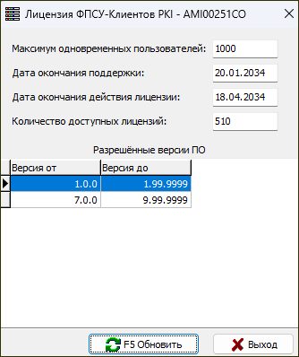 Лицензия на количество подключаемых к ФПСУ-IP Клиентах PKI загружается на ФПСУ-IP путем установки обновления. УА предоставляет возможность просмотра данных лицензии, загруженной на ФПСУ-IP. Для получения информации о лицензии на подключение PKI Клиентов, работающих через ФПСУ-IP, следует выбрать ФПСУ-IP в окне списка, и нажать кнопку «Лицензии PKI» панели команд. На экран будет выдано информационное окно, содержащее данные о подключаемых к ФПСУ-IP PKI Клиентах. В данном окне отобразятся следующие сведения: •Максимум одновременных пользователей - максимальное количество Клиентов PKI, которое может быть одновременно подключено к ФПСУ-IP. Если с ФПСУ-IP уже установили соединение указанное в этом поле количество пользователей, новые подключения от других Клиентов PKI не будут устанавливаться; •Дата окончания поддержки. Клиенты с датой сборки позднее даты окончания поддержки не смогут устанавливать соединения с ФПСУ-IP; •Дата окончания действия лицензии. После указанной даты ФПСУ-IP не будет принимать соединения от Клиентов PKI. Потребуется установить обновленную лицензию PKI Клиентов на ФПСУ-IP. •Количество доступных лицензий - оставшийся запас, количество Клиентов, которые в настоящий момент могут подключаться к ФПСУ-IP (вычисляется как "Максимум одновременных пользователей" минус "число текущих активных Клиентов PKI"); •Разрешенные версии ПО - таблица справочной информации, в которой указаны диапазоны версий программного обеспечения Клиента PKI, которым разрешено подключение к ФПСУ-IP. Клиенты PKI с версией не из этих диапазонов, соединиться с ФПСУ-IP не смогут.