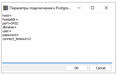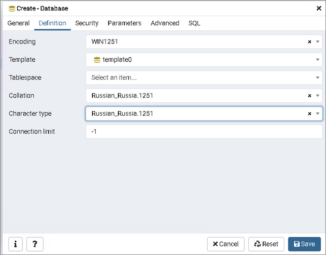 Внимание! В случае отсутствия активной работы с БД в течение 15 минут соединение с ней будет принудительно прервано и автоматически восстановлено при следующем обращении к БД. Следует иметь в виду, что для корректной работы со внешней БД PostgreSQL из УА необходимо, чтобы при создании новой базы данных в PGAdmin были заданы следующие параметры: • ENCODING = 'WIN1251' • TEMPLATE = template0 • COLLATION = 'Russian_Russia.1251' • CHARACTER TYPE = 'Russian_Russia.1251'