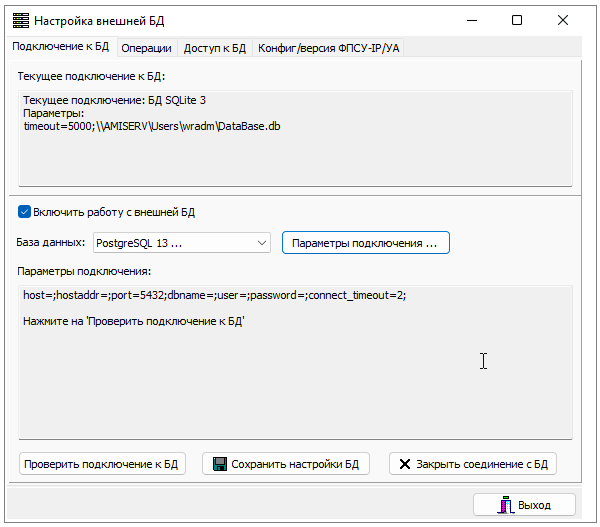 Все настройки внешней БД осуществляются в одноименном окне, открывающемся по нажатию кнопки