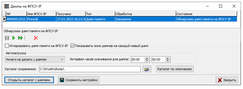 Флаг «Игнорировать дамп памяти на ФПСУ-IP» – при установлении флага если обнаружен дамп, окно со списком дампов не показывается. При выключенном флаге отображается окно со списком дампов при обнаружении дампа. |