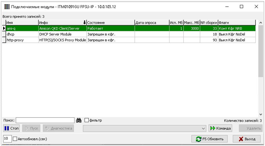 Для установки на ФПСУ-IP или удаления с него ключевых данных ProtoQa и CRISP, следует выбрать ФПСУ-IP в основном окне и нажать кнопку «Модули» на панели команд.