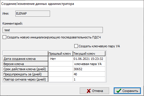 В открывшемся окне будут указаны имя администратора, комментарий к нему, дата создания ключа (для предыдущих версий) и ключевой пары УА ФПСУ-IP, а также срок действия ключей ключевой пары. Для пересоздания ключевых данных необходимо установить флаг «Создать ключевую пару УА» и нажать кнопку «Сохранить». |