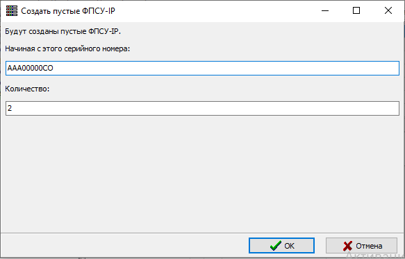 К списку ФПСУ-IP могут быть применены массовые операции и массовое конфигурирование, перед этим следует создать пустые ФПСУ-IP. ФПСУ-IP могут быть зарегистрированы массово для дальнейшей настройки параметров выбором пунктов «Регистрация пустых ФПСУ-IP...» или «Регистрация пустых ФПСУ-IP из файла» меню «ФПСУ-IP». При выборе пункта «Регистрация пустых ФПСУ-IP...» меню «ФПСУ-IP» предоставляется возможность зарегистрировать ФПСУ-IP. В открывшемся стандартном окне указать серийный номер создаваемых ФПСУ-IP и количество. Каждый следующий серийный номер ФПСУ-IP, будет присвоен по порядку, начиная с указанного.