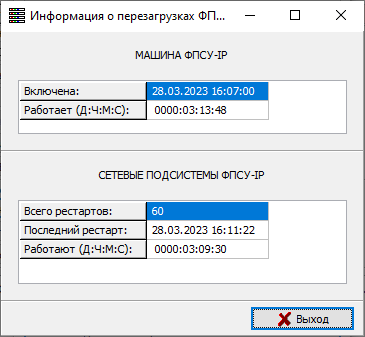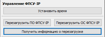 Кнопка «Перезагрузить ПО ФПСУ-IP», расположенная в этом разделе, позволяет перезапустить исполняемый файл. Кнопка «Перезагрузить ОС ФПСУ», так же расположенная в этом разделе, позволяет произвести мягкий рестарт ОС с загрузкой нового ядра и стартом ОС с нуля. По нажатию кнопки «Получить информацию о перезагрузке» вызывается справочное окно о времени включения и непрерывной работы ФПСУ-IP, и общее количество перезагрузок ФПСУ-IP с указанием времени последней перезагрузки.