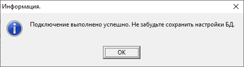 Система выдаст сообщение об успешной проверке подключения, после чего необходимо будет сохранить настройки БД, нажав одноименную кнопку. |