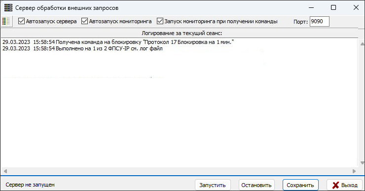 В открывшемся окне необходимо выбрать ФПСУ-IP для мониторинга и подтвердить свой выбор нажатием одноименной кнопки. Далее, вернувшись к окну «Сервер обработки внешних запросов» можно указать следующие параметры работы УА ФПСУ-IP с сервером: •Автозапуск сервера - для запуска сервера блокировки трафика в автоматическом режиме; •Автозапуск мониторинга - для запуска мониторинга блокировок в автоматическом режиме; •Запуск мониторинга при получении команды - для запуска мониторинга только при получении команды. Кроме того в УА ФПСУ-IP предоставляется возможность изменить порт, по которому сервер блокировки получает запросы (по умолчанию 9090). После установки соответствующих флагов мониторинг можно запустить, нажав одноименную кнопку. Запущенный мониторинг можно остановить так же по нажатию одноименной кнопки. В случае получения команды на блокировку/разблокировку в поле «Логирование за текущий сеанс» отобразится информация о полученных командах и результатах их выполнения.