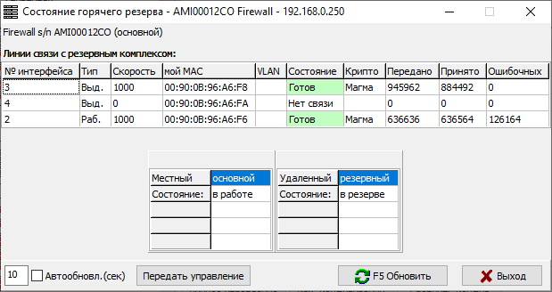 Для просмотра состояния «горячего» резервирования на выбранном ФПСУ-IP, следует нажать кнопку