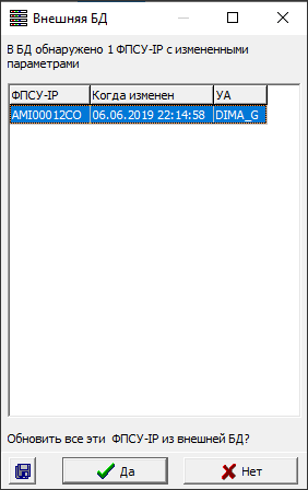 Программным обеспечением предоставляется возможность проверки наличия изменений в описателях ФПСУ-IP, хранящихся во внешней базе данных, по сравнению с данными этих ФПСУ-IP на УА ФПСУ-IP. Для того, чтобы проверить наличие изменений, необходимо нажать кнопку «Проверить в БД обновления ФПСУ-IP» (кнопка активна для УА, имеющих право на чтение ФПСУ-IP - раздел «Изменение прав доступа УА к БД»). Система выдаст сообщение о найденных во внешней БД ФПСУ-IP с измененными параметрами.
