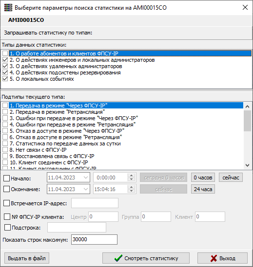 Статистическую информацию по работе выбранного в окне списка ФПСУ-IP можно получить, нажав кнопку «Статистика ФПСУ-IP» панели команд. Необходимо, чтобы между УА ФПСУ-IP и ФПСУ-IP было установлено успешное соединение, на УА ФПСУ-IP была настроена БД статистики, включен сбор статистики ФПСУ-IP, подробнее см. пункт «Получение статистической информации». В открывшемся окне выбора статистических данных, запрашиваемых с ФПСУ-IP, необходимо установить условия поиска: необходимые типы и подтипы данных и значения интервалов даты и времени. С помощью кнопок «Сегодня 0 часов» и «Сейчас» можно быстро установить время съёма информации за текущие сутки.
