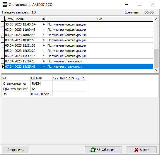 После выбора требуемых параметров необходимо нажать кнопку «Смотреть статистику», или «Выход» для отмены процедуры запроса. В отдельном окне выводятся записи статистики в хронологическом порядке с датой и типом события.