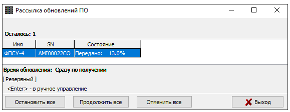 Если требуется остановить (продолжить) или отменить рассылку всей группе ФПСУ-IP, следует воспользоваться командами окна «Остановить все», «Продолжить все» и «Отменить все». Нажав кнопку «Выход», можно скрыть окно рассылки. |