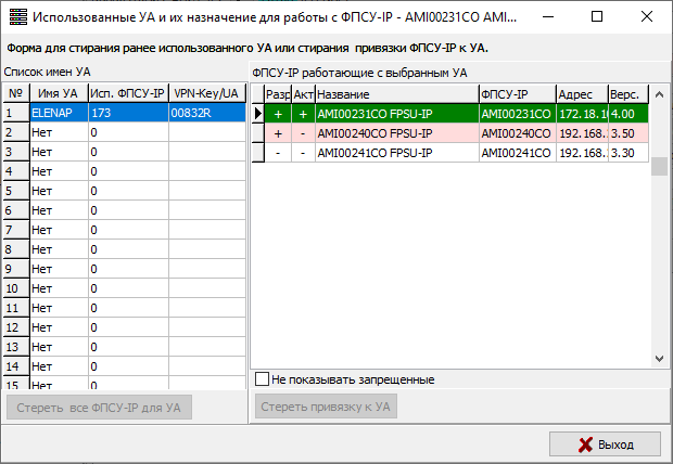 УА ФПСУ-IP поддерживает режим работы с несколькими VPN-Key/UA одновременно. При этом потребуется вводить PIN-коды всех устройств во время запуска УА ФПСУ-IP. При одновременной работе с несколькими VPN-Key/UA, администратор УА ФПСУ-IP может выбирать, из какого VPN-Key/UA брать данные для установления защищенного соединения с ФПСУ-IP. По умолчанию, соединение будет устанавливаться с помощью того VPN-Key/UA, PIN-код которого первым был затребован при запуске УА ФПСУ-IP. Для изменения порядка соединения с ФПСУ-IP при одновременном использовании нескольких VPN-Key/UA, необходимо выполнить команду основного меню «Ключ УА» → «Используемые УА». Появится окно привязки учетной записи администратора к ФПСУ-IP, в котором можно выбрать, какие администраторы УА ФПСУ-IP будут работать с какими ФПСУ-IP.